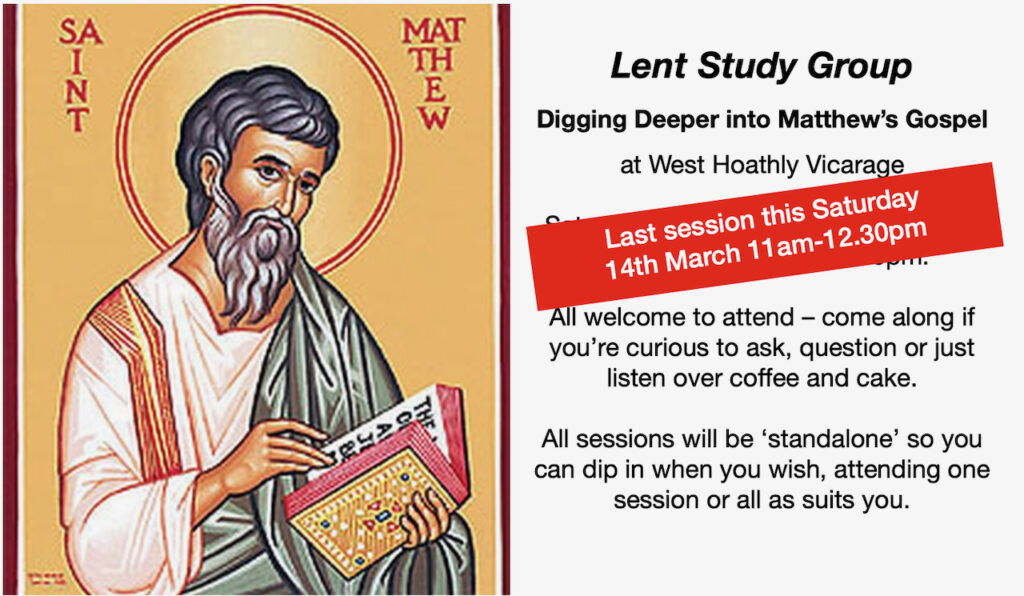 ‘Digging Deeper into Matthew’s Gospel’. Rev’d Heather will be running a Benefice Lent Study Group on Saturdays 7th and 14th March from 11am – 12:30pm The sessions will be ‘standalone’ so you can dip in when you wish, attending one session or all as suits you. Coffee, Cake and Chat about Matthew’s gospel in the Vicarage.